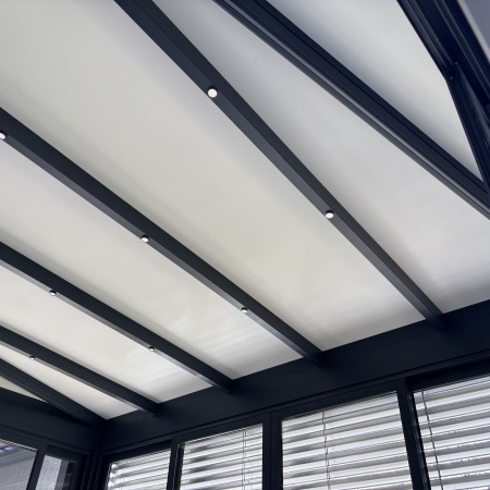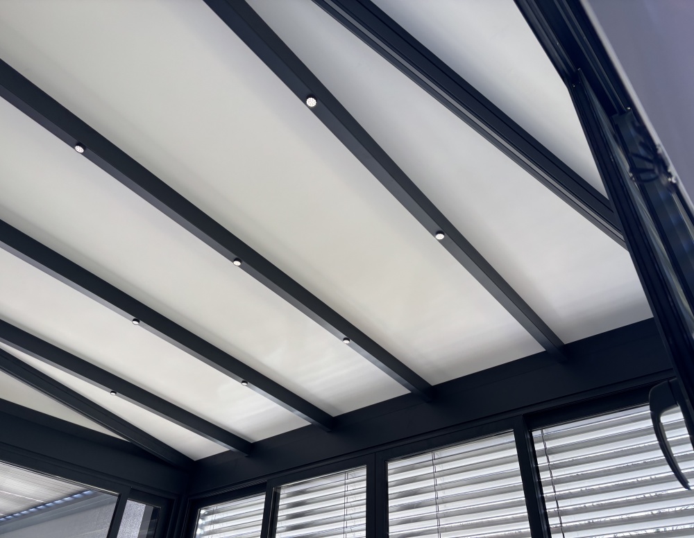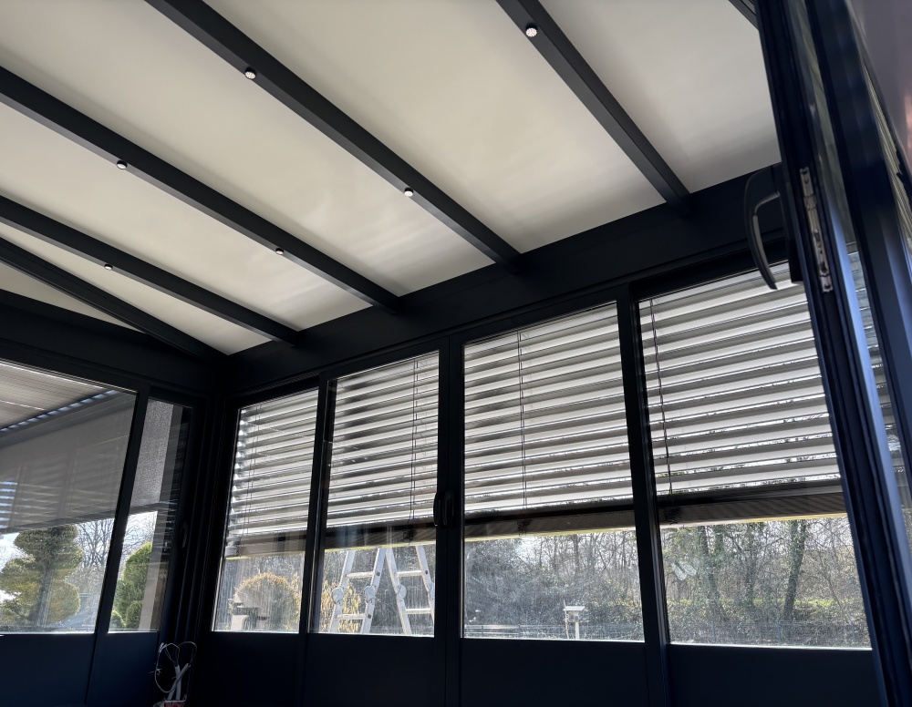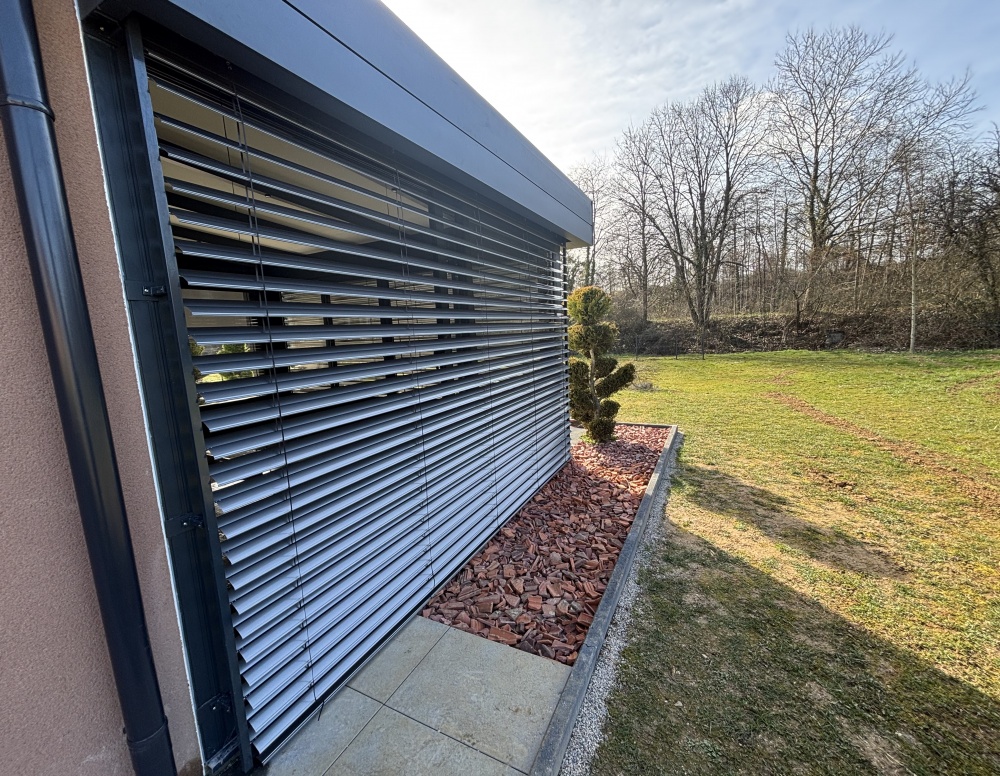Réalisation d'une Pergola Bioclimatique et Véranda accolée Ville : DAMBENOIS Année : Description : Véranda avec BSO ( brise soleil orientable ) et Pergola Bioclimatique avec store verticaux Zip pppppppppppp