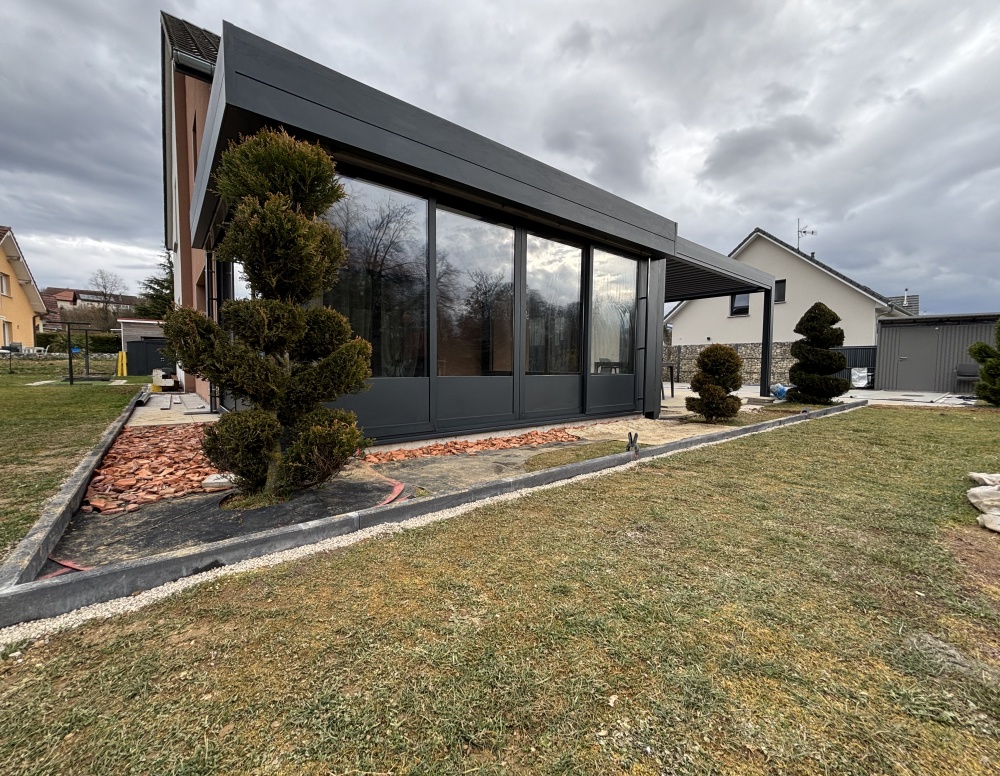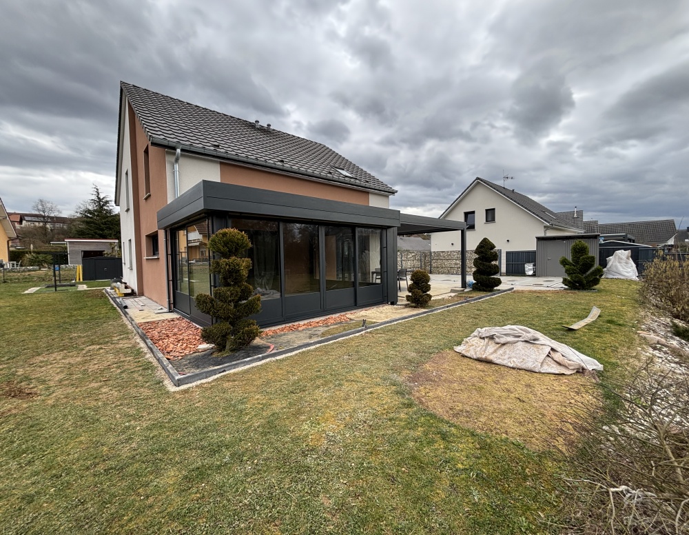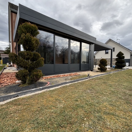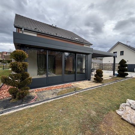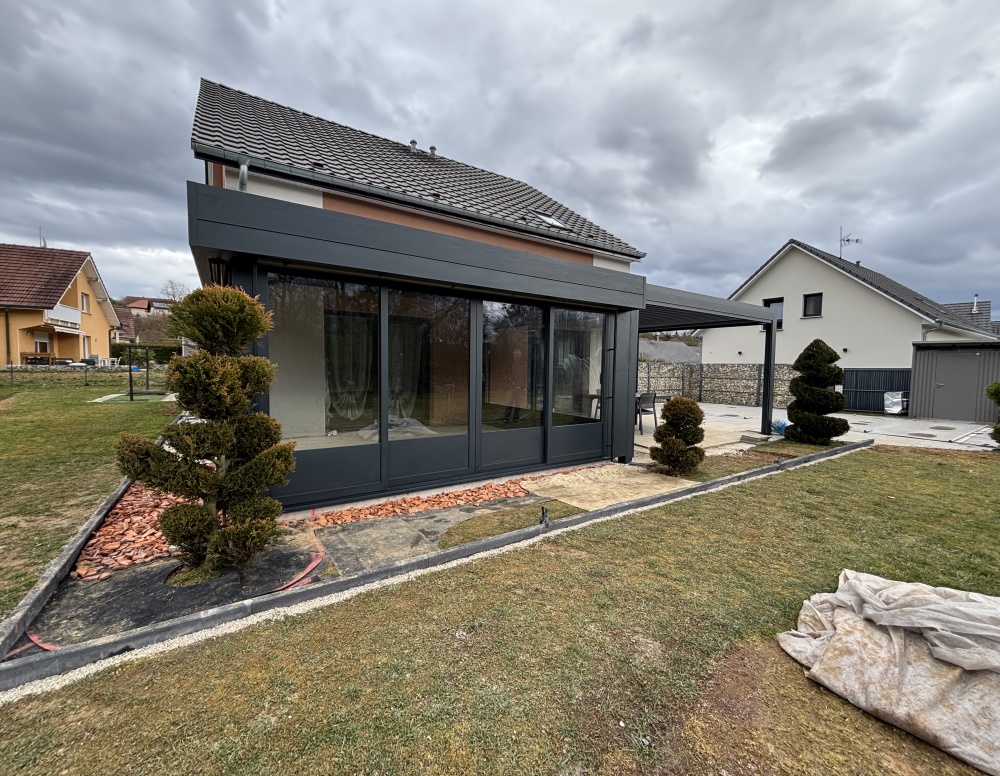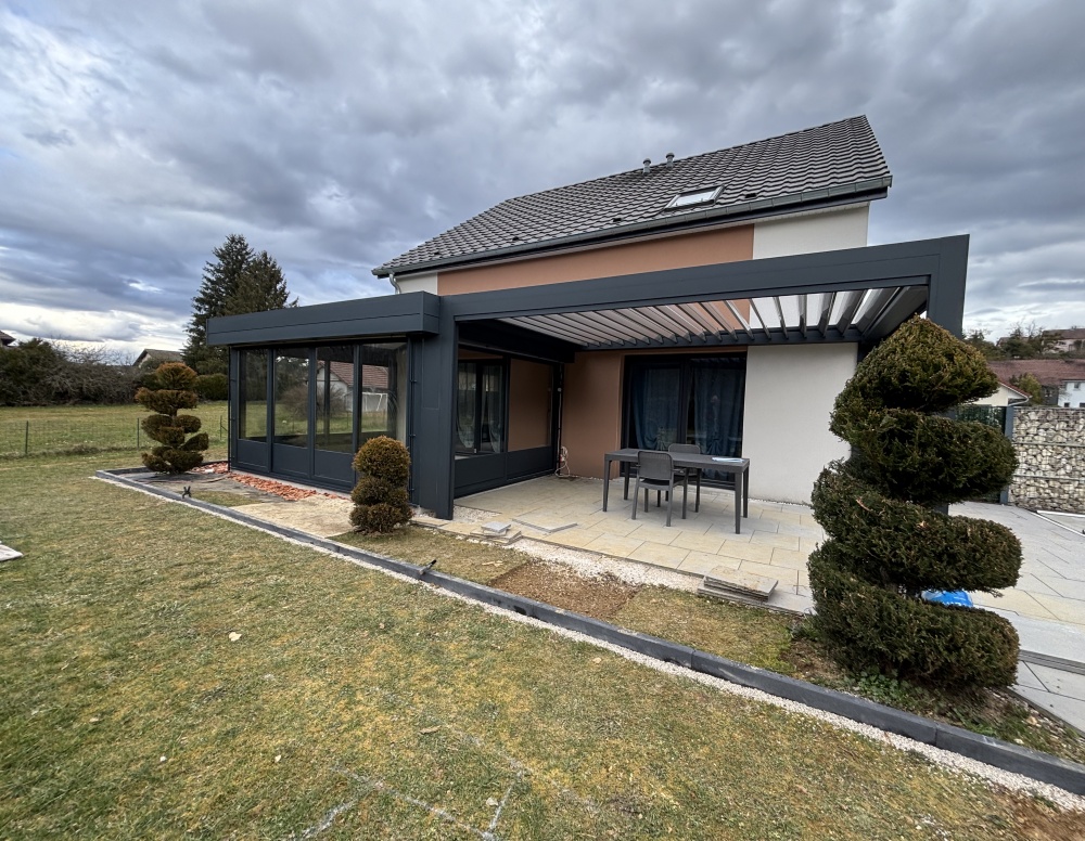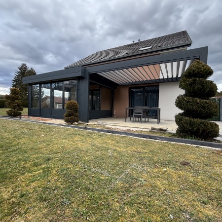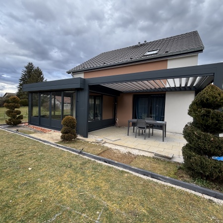 Réalisation d'une Pergola Bioclimatique et Véranda accolée Ville : DAMBENOIS Année : Description : Véranda avec BSO ( brise soleil orientable ) et Pergola Bioclimatique avec store verticaux Zip pppppppppppp