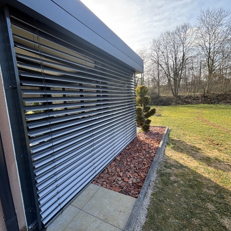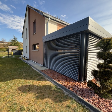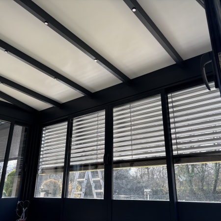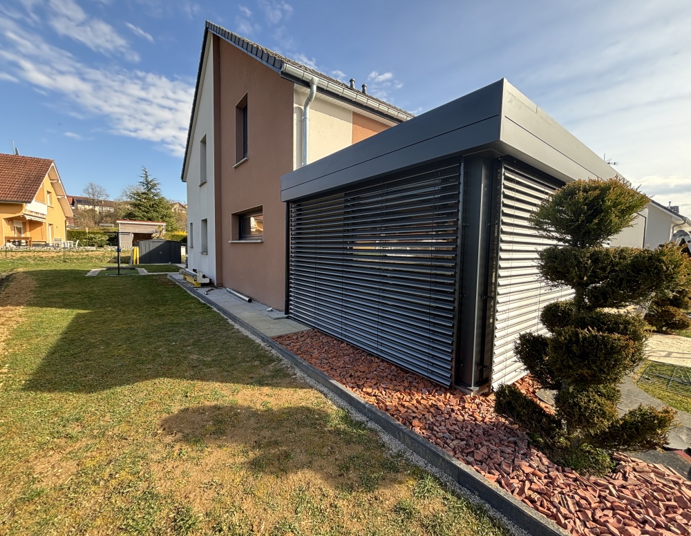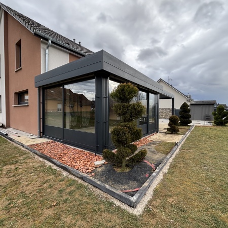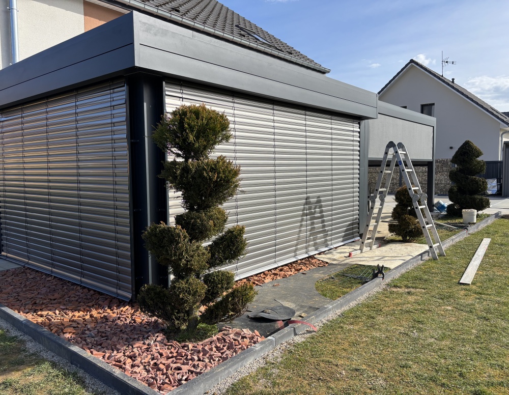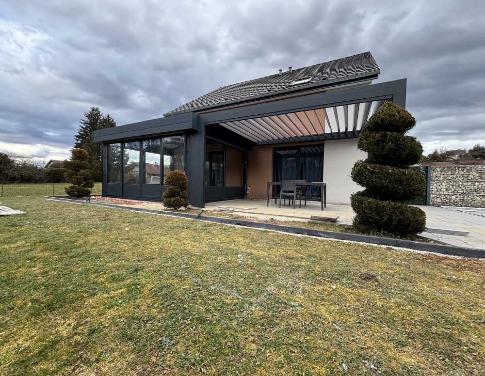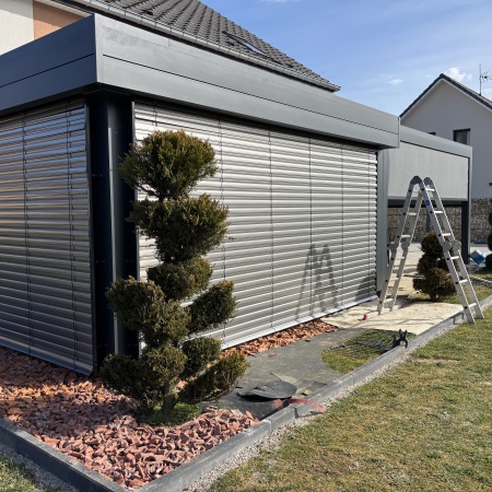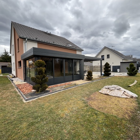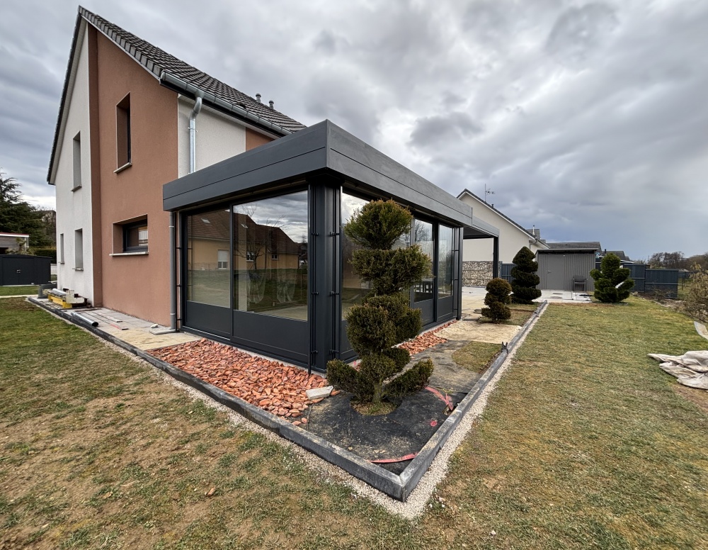 Réalisation d'une Pergola Bioclimatique et Véranda accolée Ville : DAMBENOIS Année : Description : Véranda avec BSO ( brise soleil orientable ) et Pergola Bioclimatique avec store verticaux Zip pppppppppppp